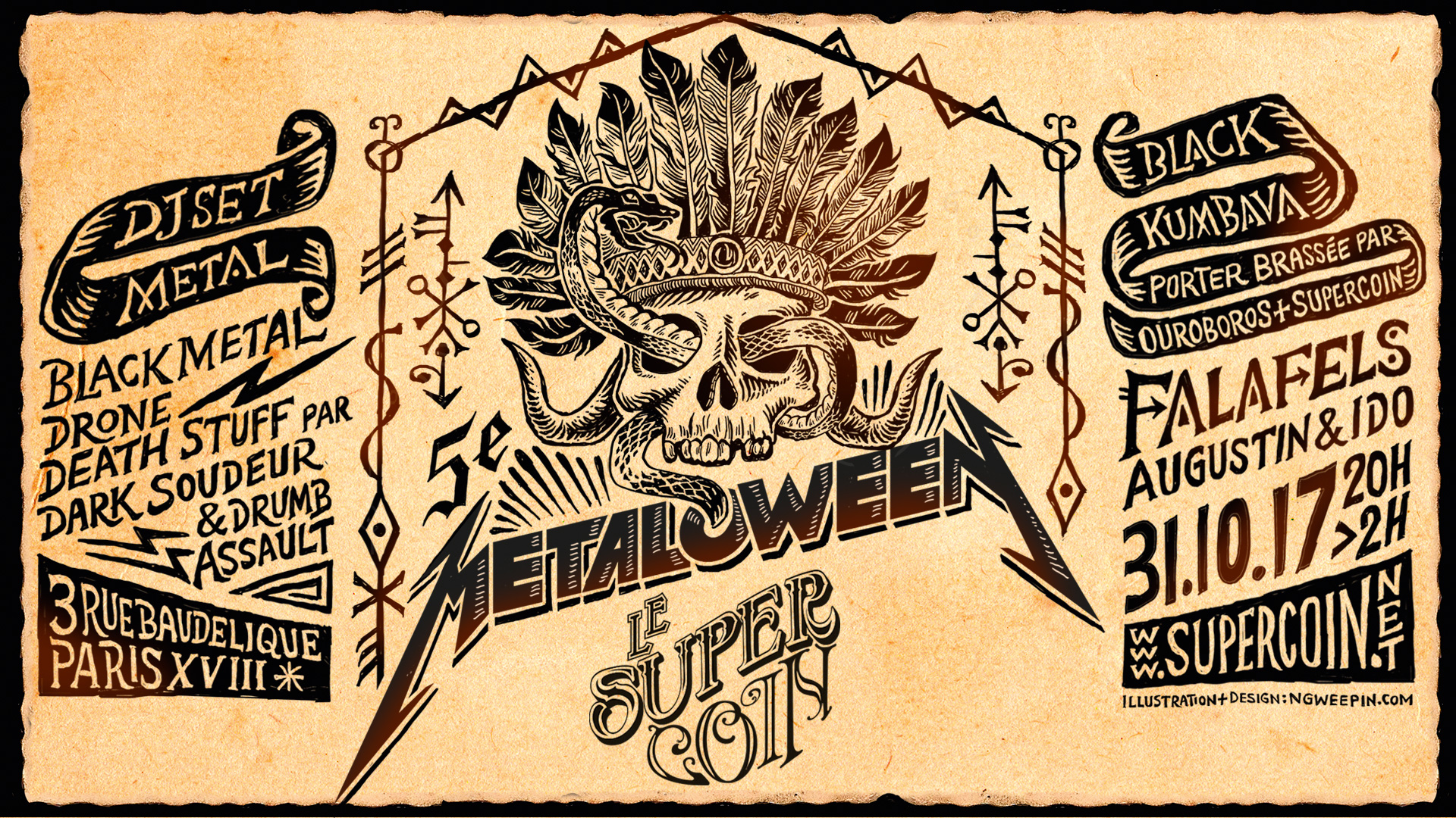 Heavy glam, gotho-viking, psyche-vaudou, black grindcore, sludge chrétien, t-shirt loup au clair de lune et tête de mort… Une occasion unique d’exposer à la face du monde ton dark-moi profond… Et de te voir offrir une cervelle de singe par ton bar préféré (ainsi qu’une magnifique affiche Metaloween 5 format A3 si ton déguisement est vraiment chiadé).