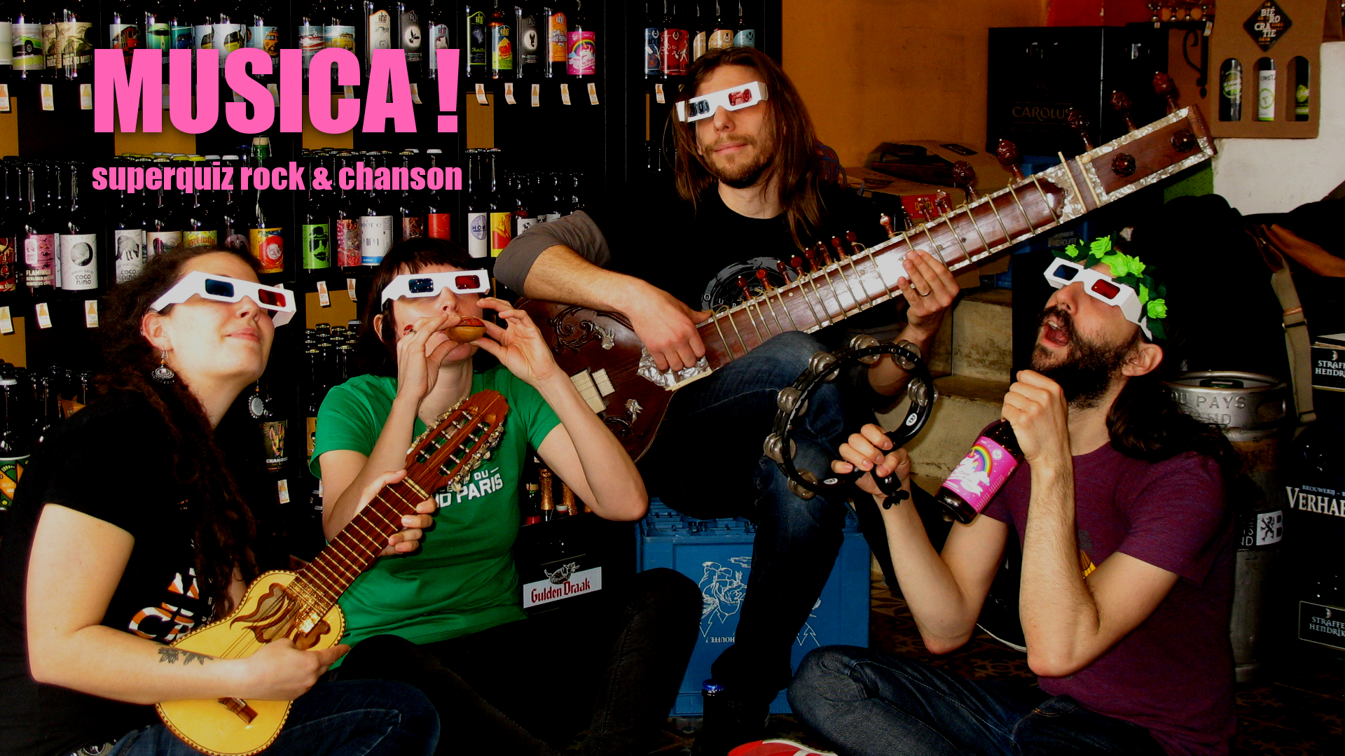 Au programme : des questions ouvertes ou fermées auxquelles répondre, du blind test rock et chanson, et des films, des personnes et autres trucs à identifier sur le thème, voire des extraits de vidéos à reconnaître. Il faudra souvent répondre le plus rapidement et lisiblement possible sur une ardoise mais pour éviter la double frustration d’être encore à Paris pendant que les copains se la coulent douce à la Bourboule et de lever sa petite ardoise 3 secondes trop tard, on sera plus coulants.